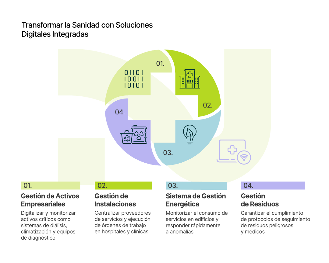- Sistemas dispares: Los datos clínicos, técnicos y de las instalaciones están desconectados.